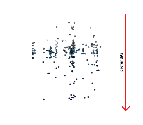 Come potete vedere al centro del grafico, esattamente sotto la superficie dell'Umbria (Regione Italiana collocata al centro dell'Italia) c'è un gruppo molto stretto di terremoti (ipocentri). Questo dato è verificato dai numerosi terremoti che si susseguono frequentemente in questa regione.